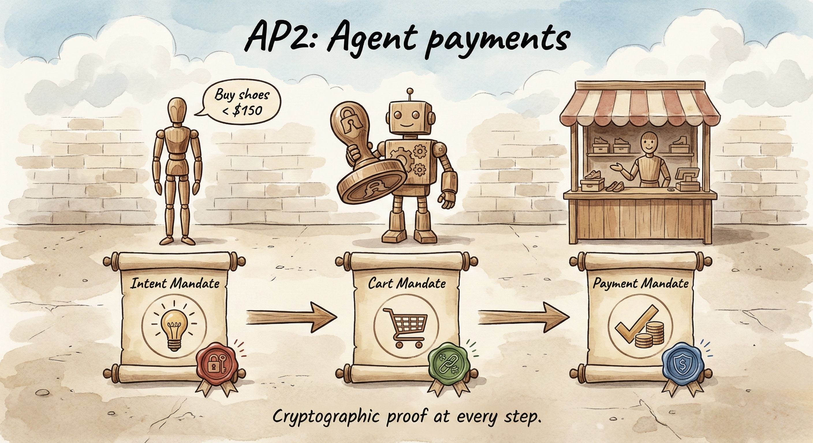 AP2 introduces "Mandates," cryptographically-signed credentials proving user intent. An Intent Mandate captures what the user wants. A Cart Mandate captures what they approved. A Payment Mandate authorizes the transaction. Every step has cryptographic proof.