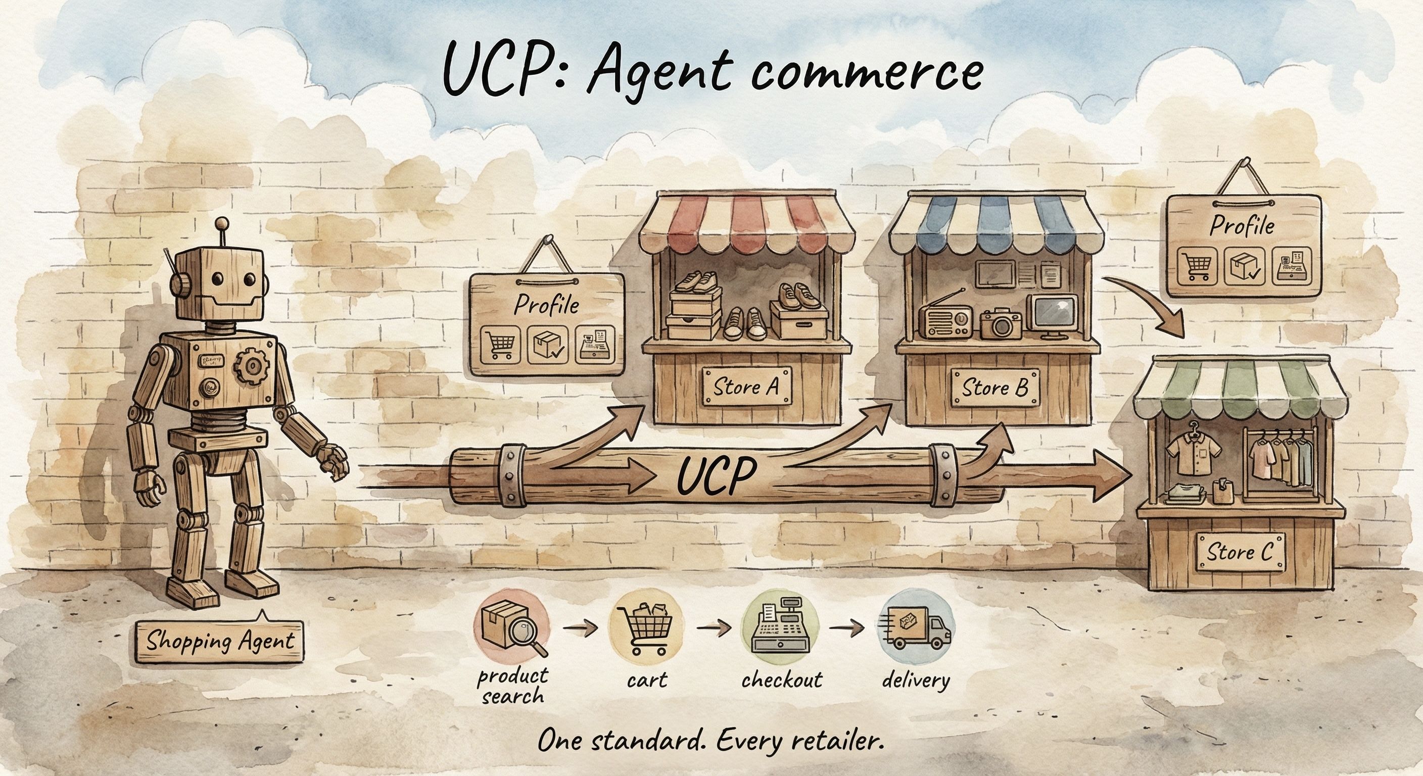 UCP is the newest layer. Google and Shopify co-developed it, announced January 2026. Walmart, Target, Etsy, Best Buy, Home Depot, and 20+ retailers already committed.