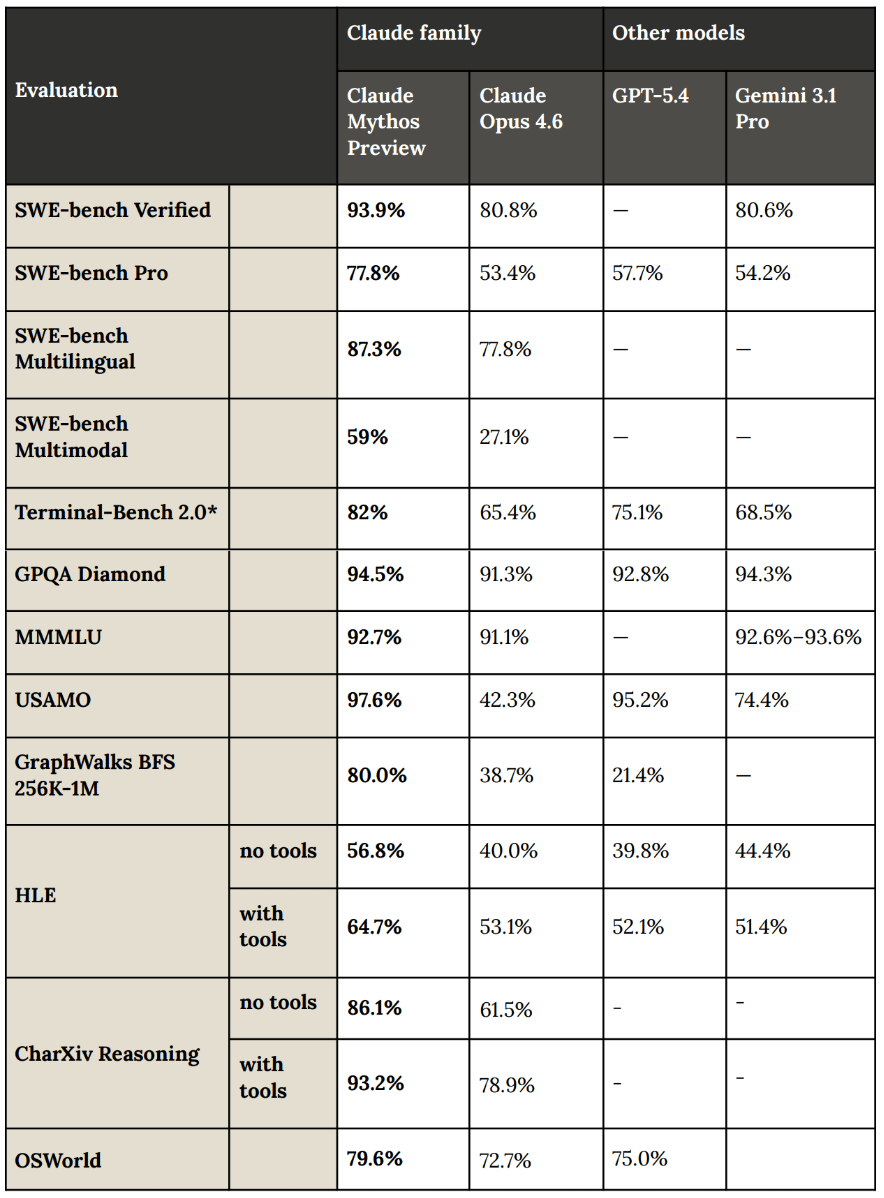 Performance gap is massive: Mythos scores 93.9% on SWE-bench Verified vs. Opus 4.6's 80.8%, and on SWE-bench Pro, the gap is even wider: 77.8% vs. 53.4%.