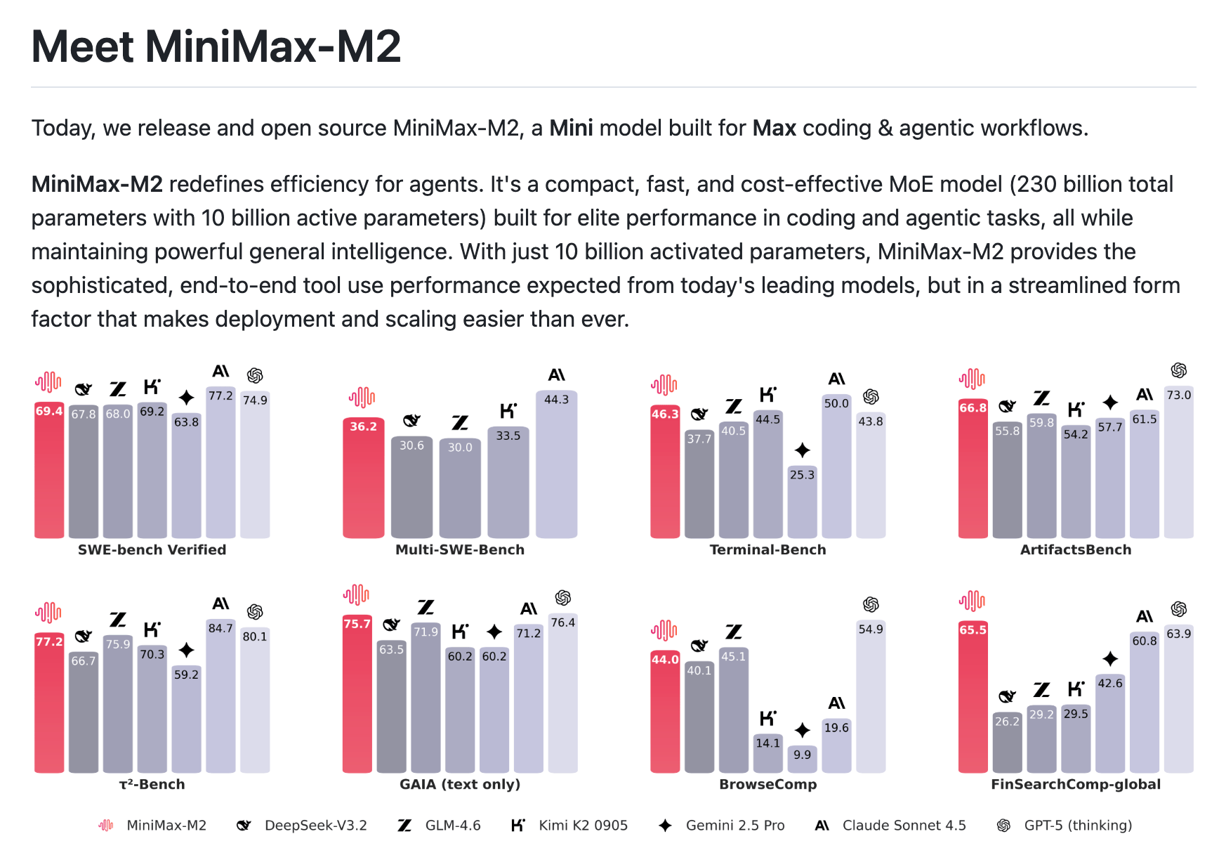 Shanghai-based MiniMax has released MiniMax-M2, an open-source 230-billion-parameter MoE model that activates only 10 billion parameters during inference, delivering Claude Sonnet-level intelligence at 8% of the price with roughly 2x the speed.