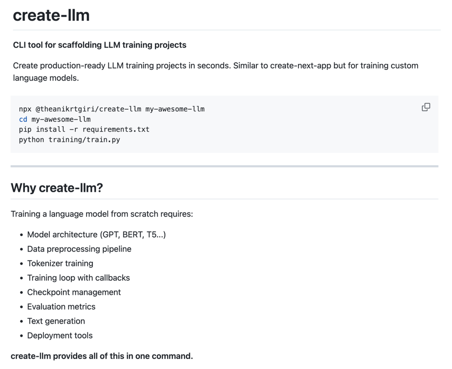 That frustration led to create-llm – a CLI tool that scaffolds complete LLM training projects instantly. One command gives you model architectures, tokenizer training, data pipelines, checkpoints, evaluation metrics, and deployment tools, all configured and ready.