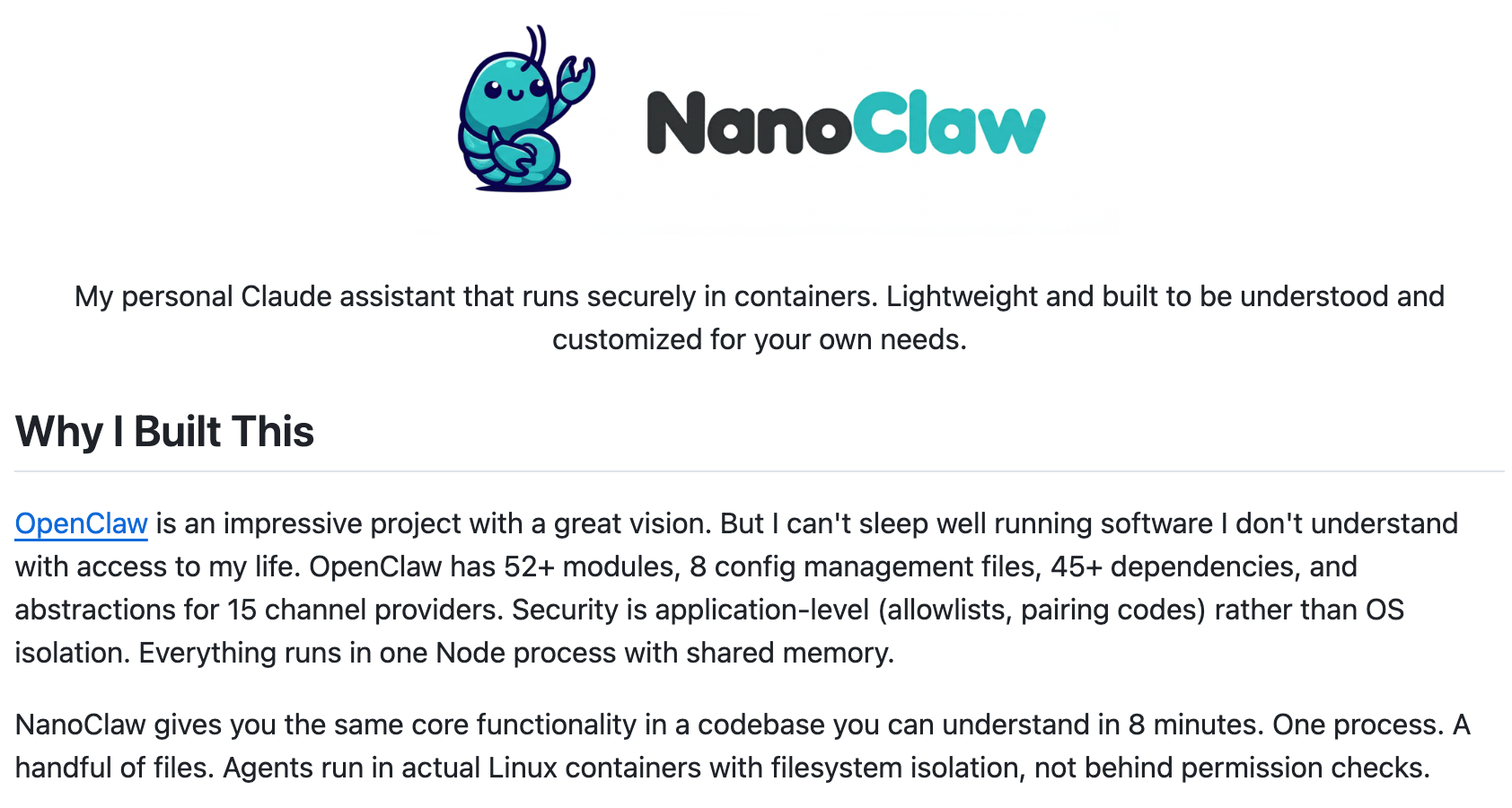 NanoClaw launched as the answer, a personal Claude assistant you can actually understand in 8 minutes.