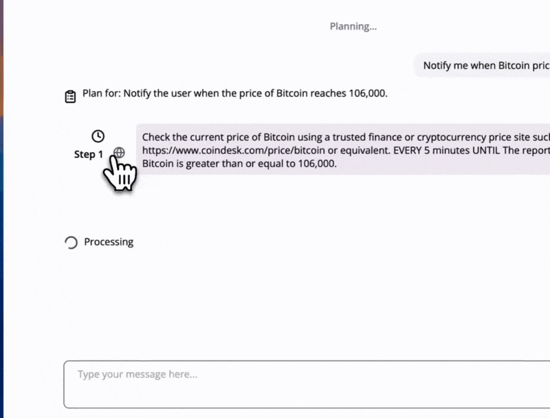 Three Components - Each monitoring step consists of actions to collect information, a condition determining task completion, and a polling interval for timing, exposed through Magentic-UI's co-planning interface for user review and adjustment.