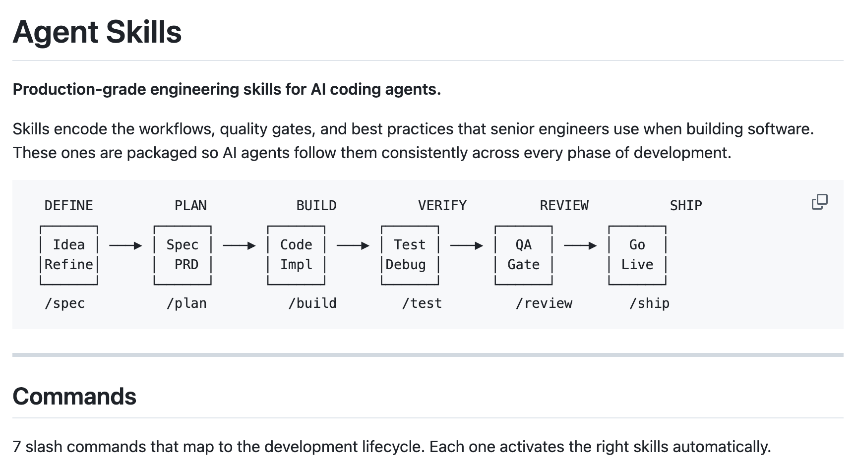 The skills map to six development phases (Define → Plan → Build → Verify → Review → Ship), and they bake in real engineering principles like Hyrum's Law, Chesterton's Fence, and trunk-based development.