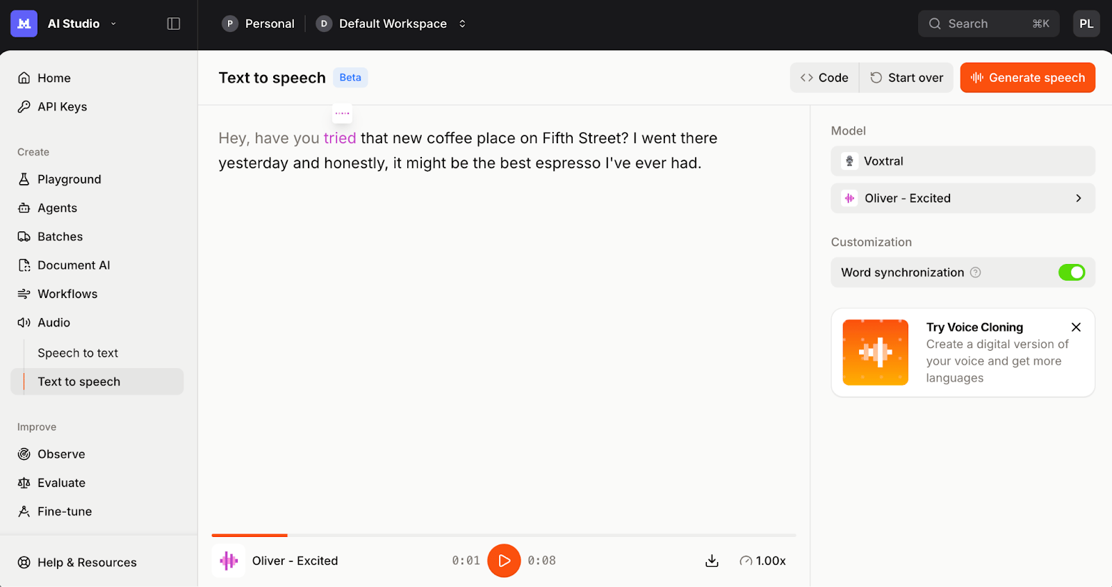 Voxtral TTS is a lightweight 4B parameter text-to-speech model with state-of-the-art performance in multilingual voice generation. It goes beyond reading text aloud, capturing a speaker's personality: natural pauses, rhythm, intonation, and emotional dexterity. Available now via API, Mistral Studio, and open weights on Hugging Face.