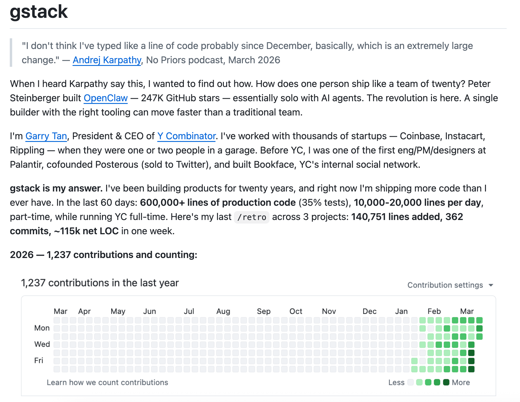 The repo hit 54K+ stars in weeks, sparked a viral debate about AI-assisted development at SXSW, and is one of the fastest-growing repos of 2026.