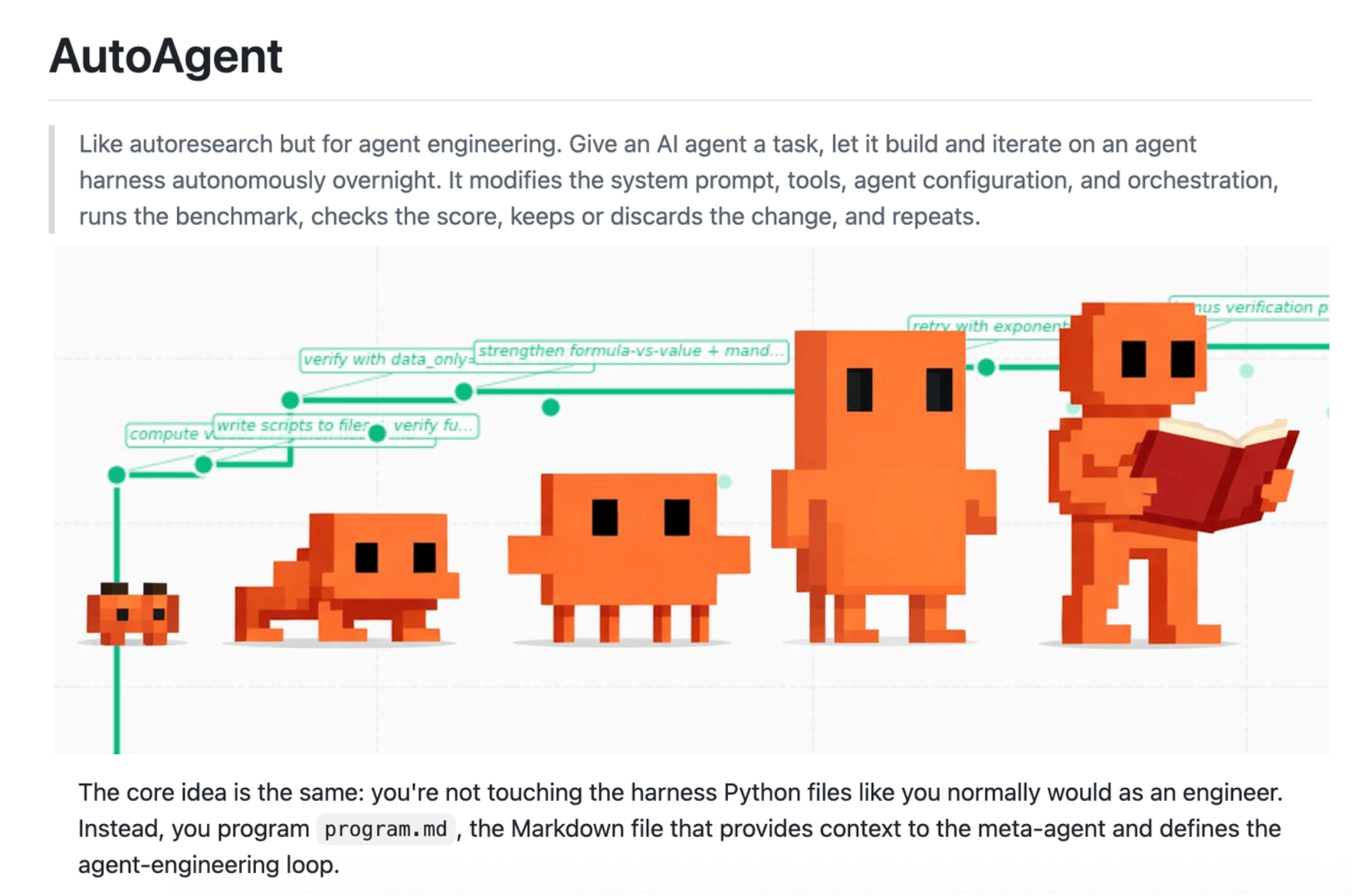 Autoresearch for Agents: Where Karpathy's loop edits training code and hill-climbs on validation loss, AutoAgent edits an agent's harness and hill-climbs on benchmark scores.