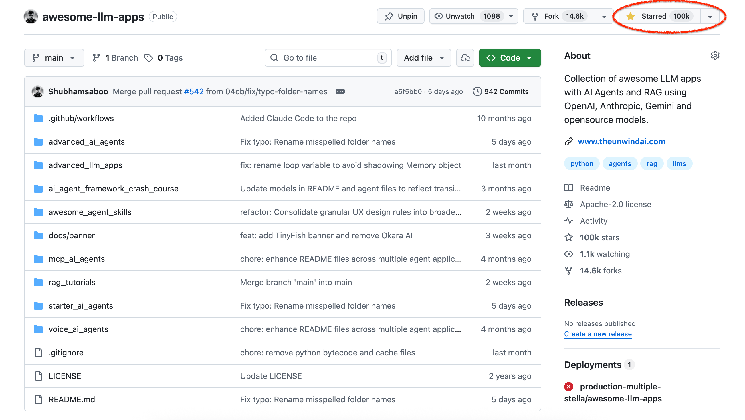 This is wild! Awesome LLM Apps is now among the top 100 most-starred repositories of all time, right up there with projects that practically run the internet.